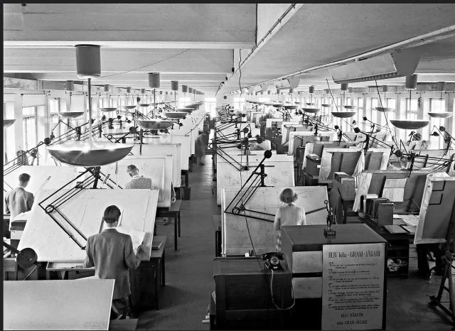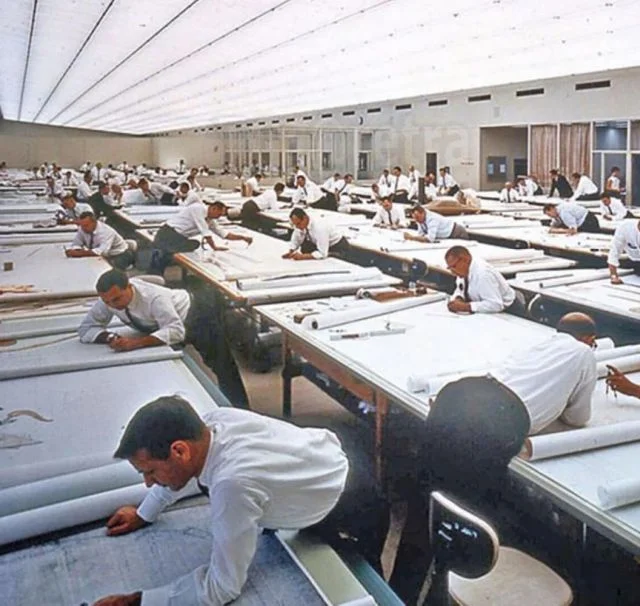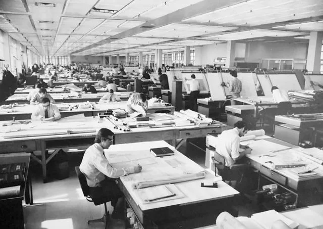 Как выглядели офисы инженеров до появления AutoCAD - двух- и трёхмерной системы автоматизированного проектирования и черчения. Эх, старые добрые деньки, когда клиент не мог вносить правки.