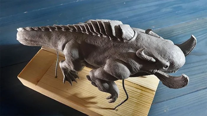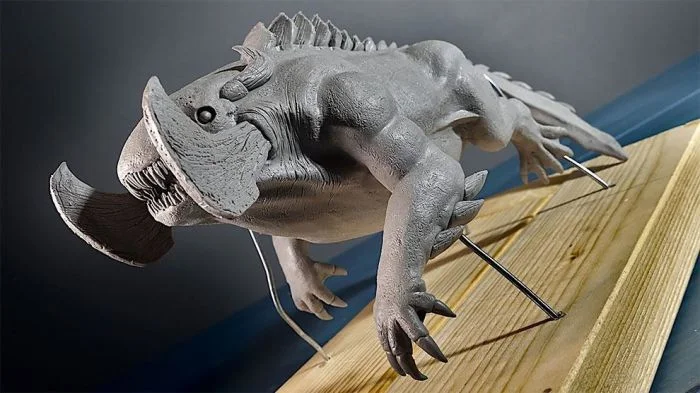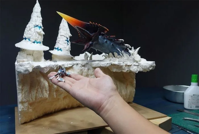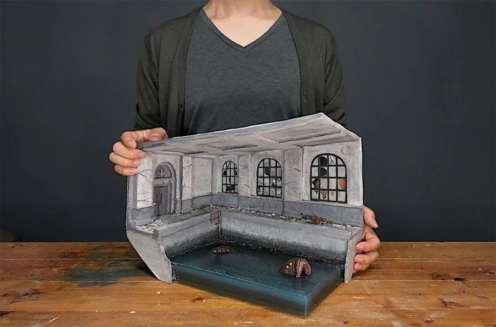 Недавно он получил множество положительных откликов за искусную диораму, которая изображает таинственный храм на скалистом побережье и китоподобное существо, поднимающееся из недр океана.