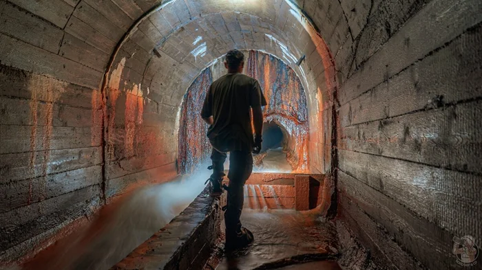 В нескольких местах штольню реки пересекают трубы с черными потёками