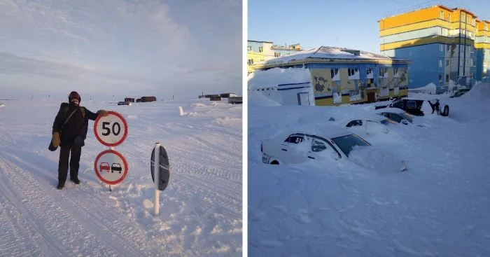 Когда замело вообще всё: и машины, и дорожные знаки.