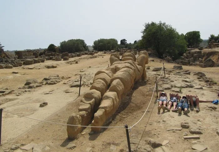 Один из гигантских атлантов из храма Зевса в Агридженто на Сицилии. Эта статуя - одна из двух почти полностью сохранившихся теламонов (архитектурных опор в виде человека) из тех 40, которые поддерживали дорический храм V века до н.э., и единственная, которую удалось переустановить на исходное место.