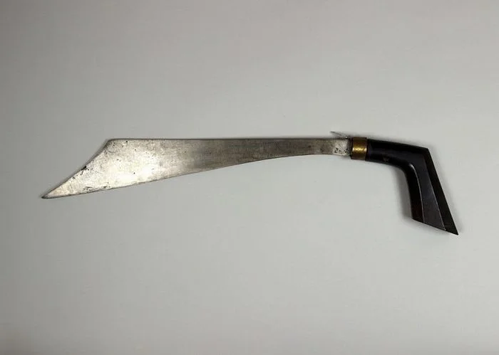 Меч палача, Индонезия, XVIII-XIX век. Меч палача отличался длинным прямым клинком, длина которого часто составляла от 90 до 120 сантиметров. Лезвие обычно было широким и толстым, что способствовало чистому и эффективному разрезу. Его вес и баланс были оптимизированы для нанесения быстрого и мощного удара, гарантирующего скорый конец приговорённого. Эфес меча палача, как правило, был простым, с основной рукоятью и перекрестием. Витиеватых украшений обычно избегали, подчеркивая утилитарный характер оружия. Меч олицетворял собой последний акт правосудия или наказания, часто вызывая чувство страха и благоговения у тех, кто наблюдал за его мрачным предназначением.