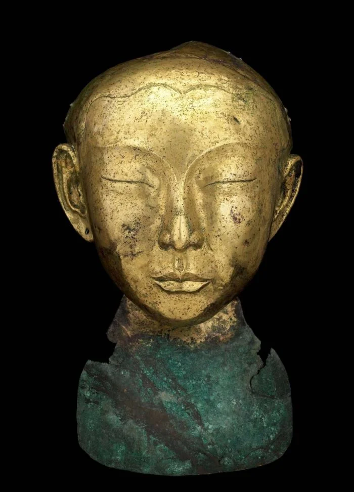 Траурная маска молодой женщины. Неизвестный ювелир, бронза. Основанная в северном Китае династия Ляо (907-1125) произвела большое количество великолепных золотых и серебряных изделий, используя традиционные китайские методы обработки металлов и золочения. В отличие от традиционных китайских погребальных обычаев, Ляо часто использовали погребальные маски из золота или позолоченной бронзы при захоронениях важных людей. Считается, что эти маски были портретами умерших. Этот великолепный образец образа безмятежной элегантной молодой женщины в натуральную величину полностью округлён и необычайно хорошо отделан. Крепление под подбородком является неотъемлемой частью маски и, завернутое под шелковую одежду, удерживает маску на месте.