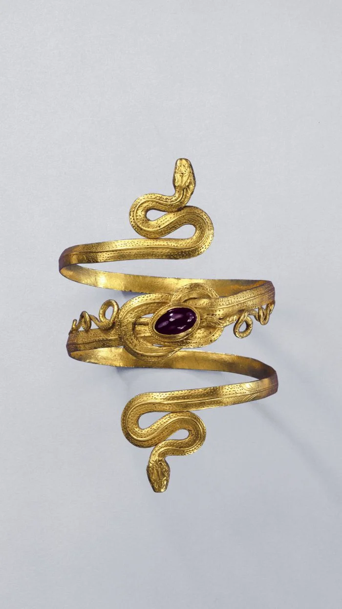 Браслет в виде змеи из золота и граната. Эллинистический период, III-II вв. до н.э. Плоский внутри, резной снаружи, свернут в спираль. Концы заканчиваются двумя свернувшимися змеями реалистичного вида , чешуя хорошо детализирована, головы тонко очерчены, тела образуют «узел Геракла» в центре. Хвосты формируют петлю и волнисто расширяются наружу по длине, в центре узла - овальный гранат-кабошон в простом ободке, обрамлённый филигранно скрученной проволокой.