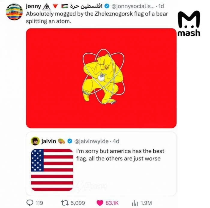 Также американцев удивил флаг Железногорска, на котором медведь ломает атом. В итоге об американском флаге все как-то забыли и переключились на флаги регионов РФ.