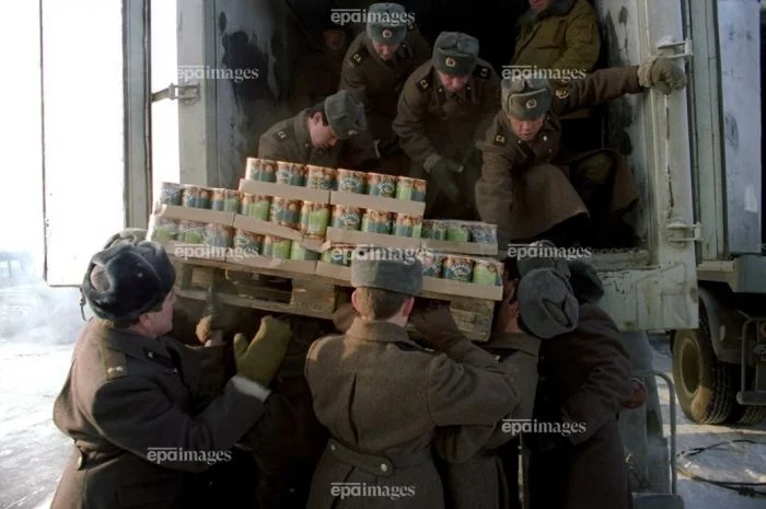Более 100 тонн продовольствия были пожертвованы людьми из французского города Брест и были направлены нуждающимся в детские дома и больницы. Чита, 1992 год.