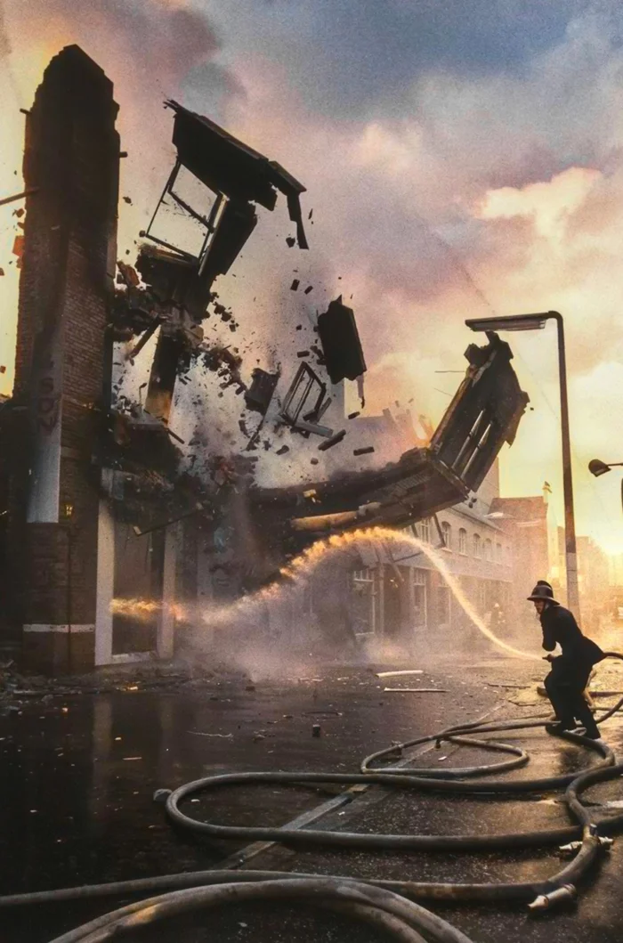 Стена горящего здания обрушилась в Белфасте, Северная Ирландия, во время межконфессиональных столкновений в 1972 году.