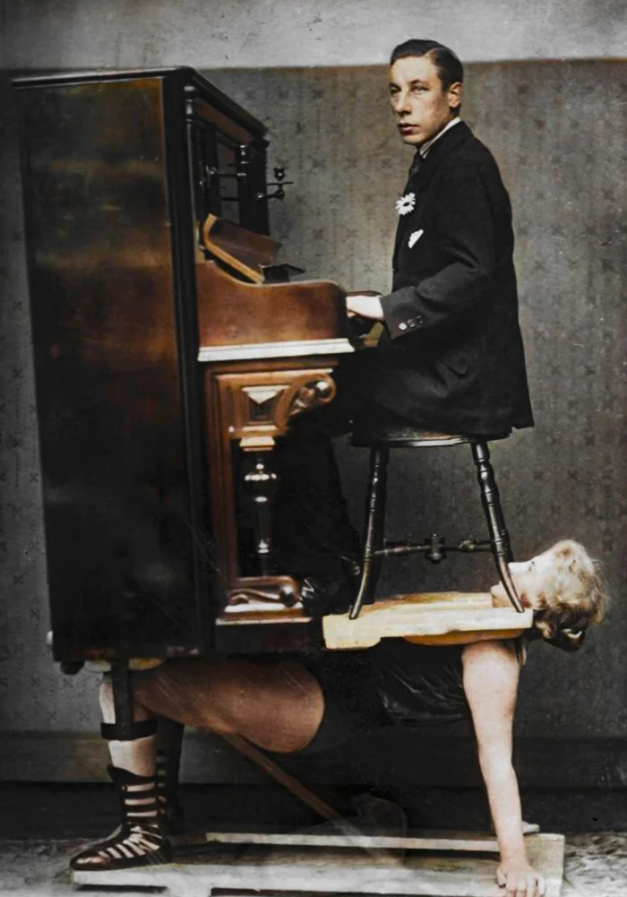 Силачка удерживает на груди пианино и пианиста, 1920-е годы.
