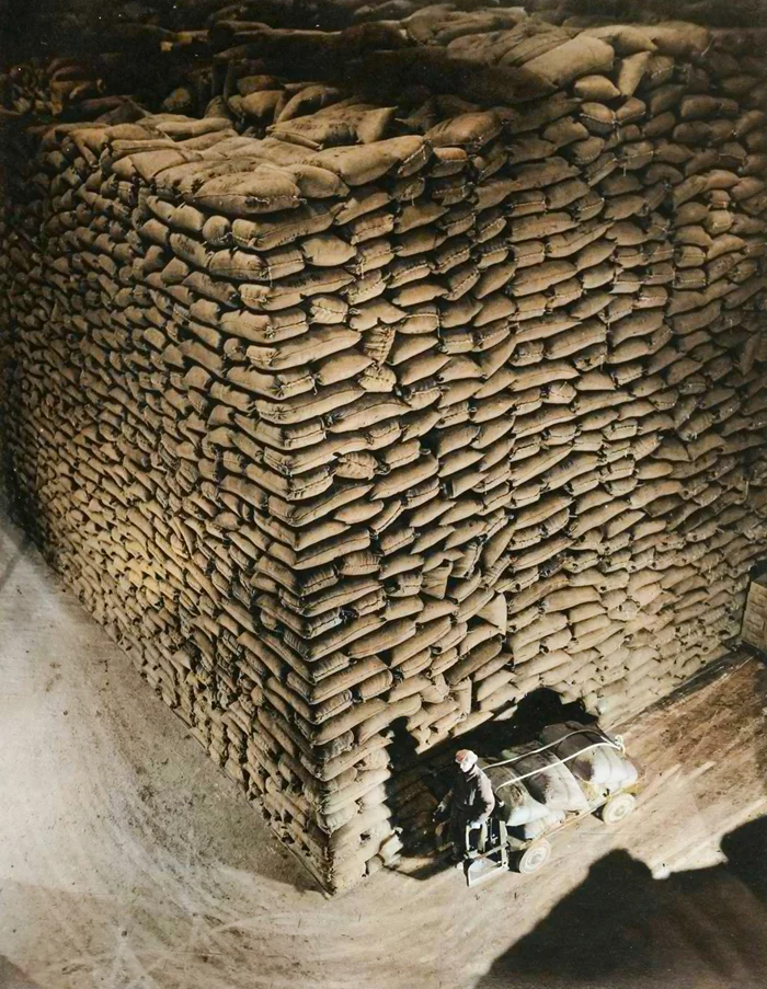 Интересно, а нижние ряды мешков не рвутся под тяжестью верхних? И как выкладывали мешки на большую высоту, ведь спецтехники того особо не было.