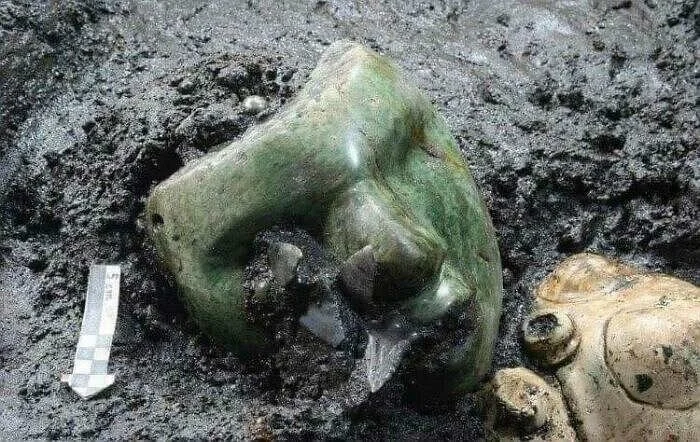 Считается, что эту маску оставили в качестве подношения богам, как часть ритуала при строительстве пирамиды. Сама маска похожа на чей-то портрет.