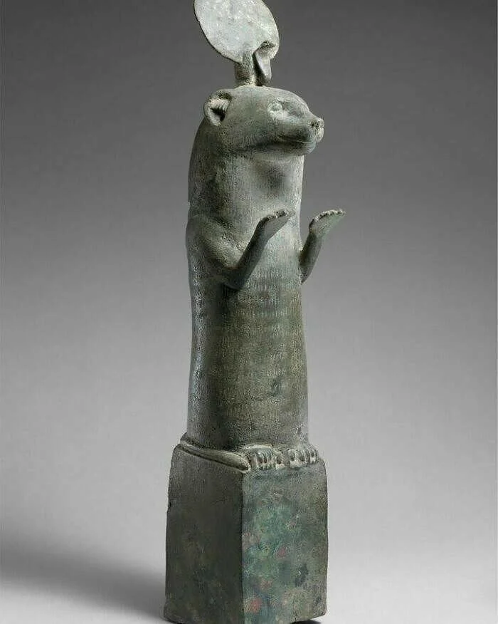 В Гелиополе это животное почиталось как воплощение бога Ра, и иногда говорили, что Ра принял облик мангуста, чтобы убить злого змея Апофиса. В гробницах было найдено множество фигурок мангустов, отлитых из бронзы. Часто на головах статуй мангустов изображён солнечный диск как символ бога солнца.
