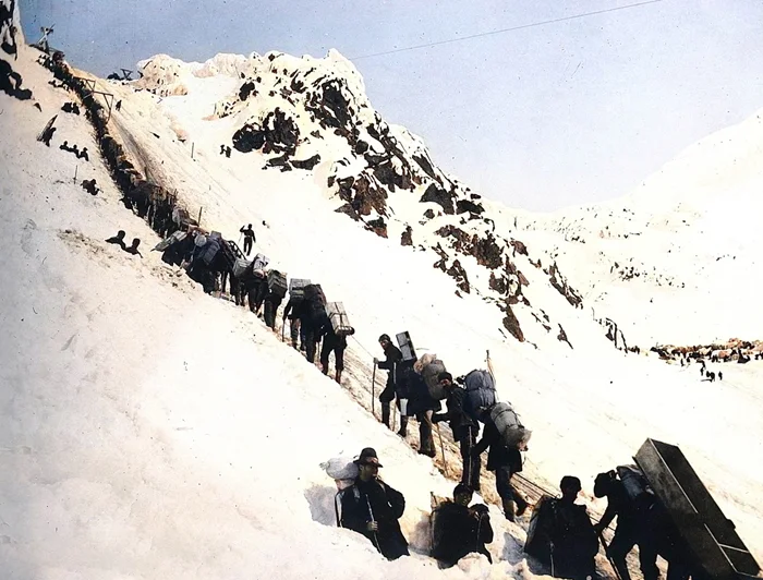 Золотоискатели переходят через перевал, 1898 год.