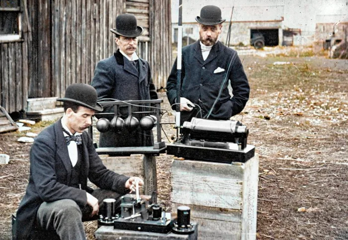 Инженеры почтового отделения Великобритании с аппаратурой Маркони на острове Флэт‑Холм в Бристольском заливе, май 1897 года.