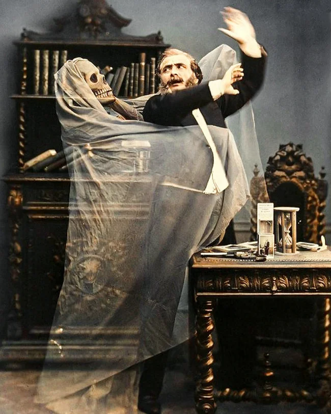 Фотография французского иллюзиониста Анри Робина с "привидением" в технике двойной экспозиции, 1863 год.