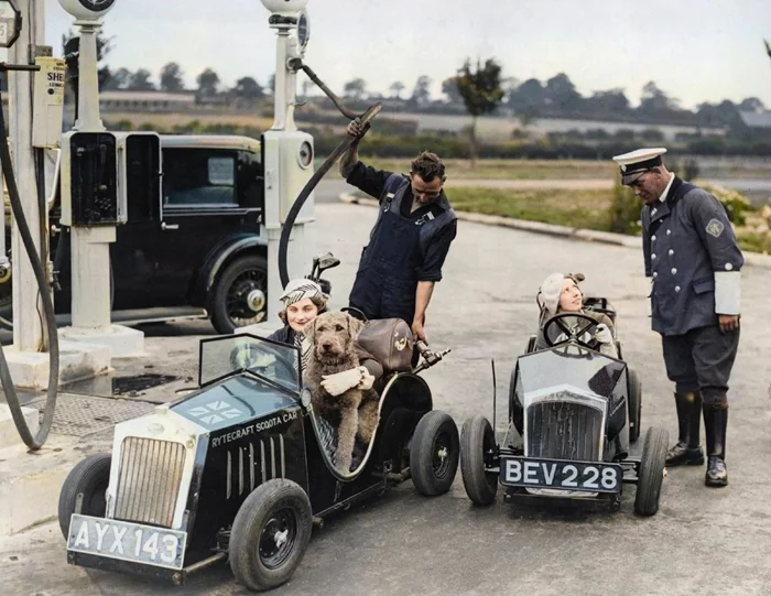 Микроавтомобили на заправочной станции недалеко от Барнета. Англия, 1934 год.
