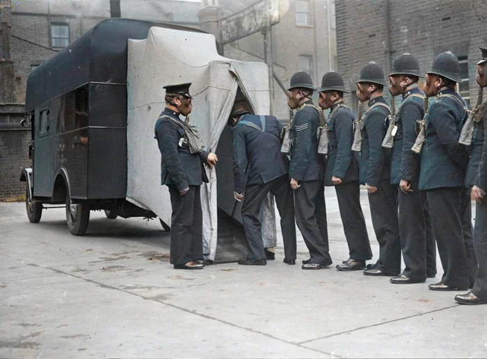 Полисмены проводят испытания противогазов в мобильной газовой камере. Лондон, 1939 год.