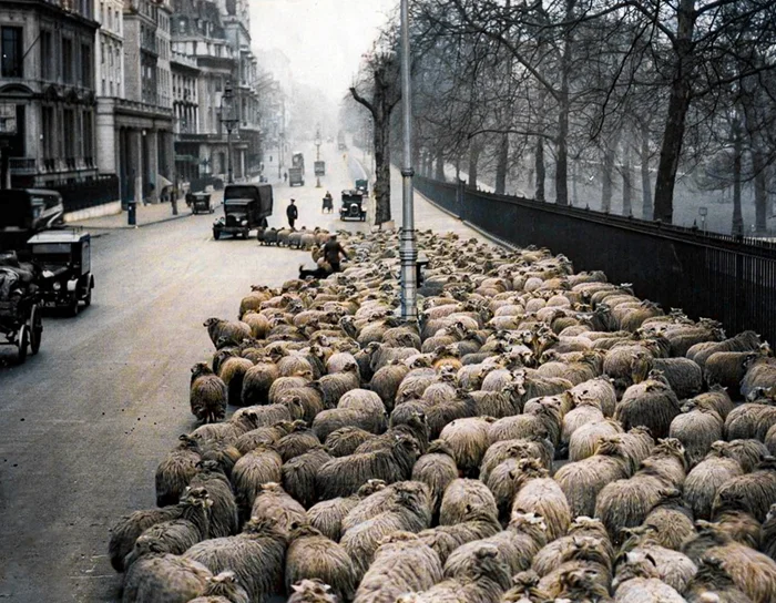 Парнокопытные «газонокосилки» идут по Пикадилли из Гайд-парка в Грин-парк. Лондон, 1931 год.