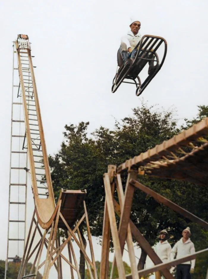Прыжки с трамплина на санях в Лондоне в 1933 году.