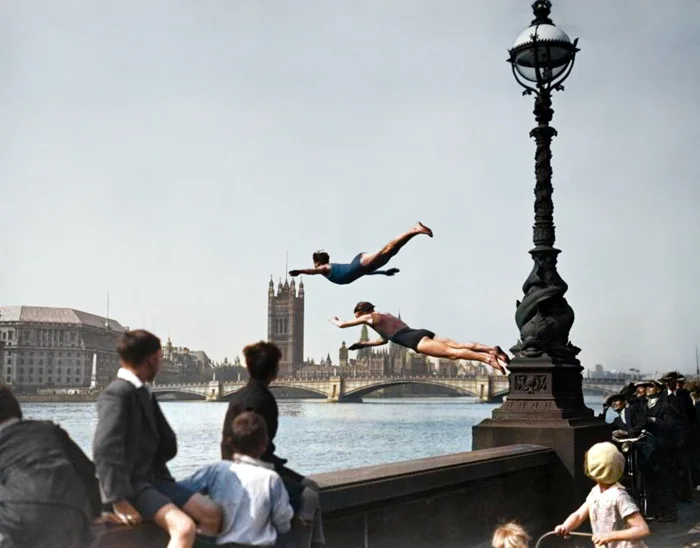 Видимо вода в реке на тот момент была намного чище. А также в 1930-е река стала популярным местом для показа моды купальников.