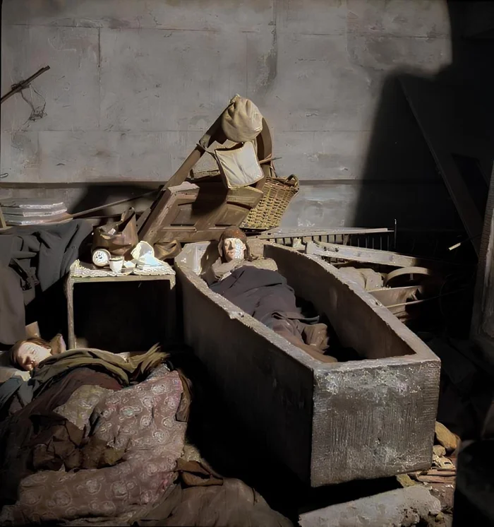 Мужчина, спящий в каменном саркофаге в церкви Восточного Лондона в ноябре 1940 года, укрывался во время воздушного налета.