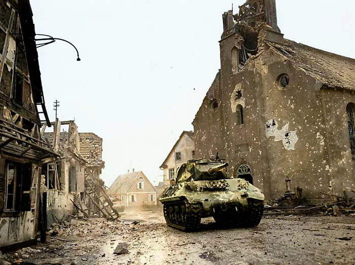 Американский танк на разрушенных улицах Франции, 1945 год.