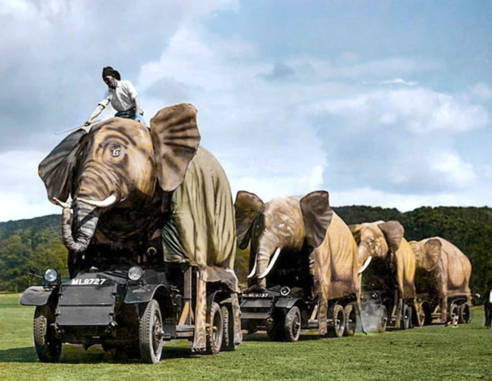 Маскировка английской военной техники под видом слонов, 1945 год.