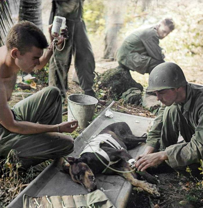 Американские солдаты на Гуаме лечат раненую собаку, 1944 год.