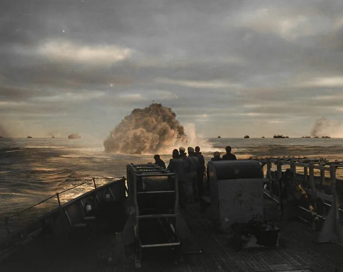 Американский корабль Спенсер USCG уничтожает подводную лодку Кригсмарине Германии, апрель 1943 года.