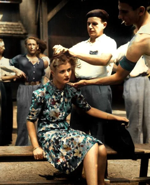 Французы ловили "немецких подстилок" и брили их налысо. Со своими женщинами легче оказалось бороться, чем с немецкой армией, сдали Францию то они быстро...