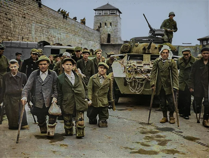 Освобожденные советские и польские заключенные-инвалиды концентрационного лагеря Маутхаузен. 5 мая 1945 года.