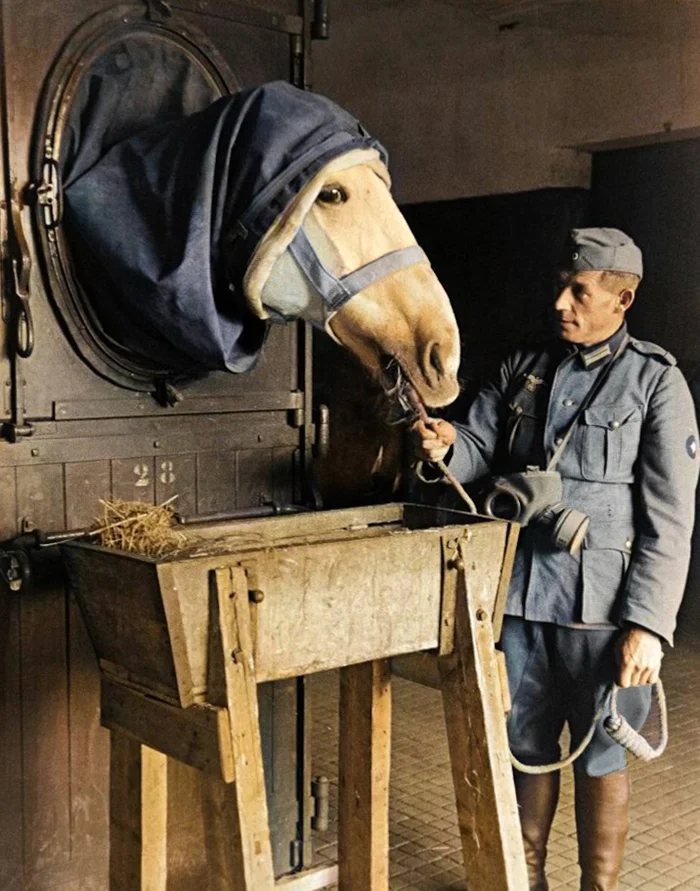 Немецкий военный госпиталь для лошадей. Лошадь проходит лечения кожного заболевания в камере, заполненной газом, 1942 год.