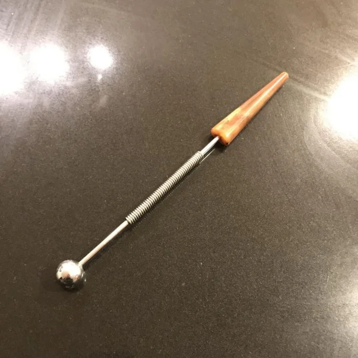 Это винтажное приспособление для колки льда. Помимо крутой бакелитовой ручки, комбинация тяжёлого шарика и пружины может генерировать достаточную мощность для колки льда при очень небольшом усилии руки.
