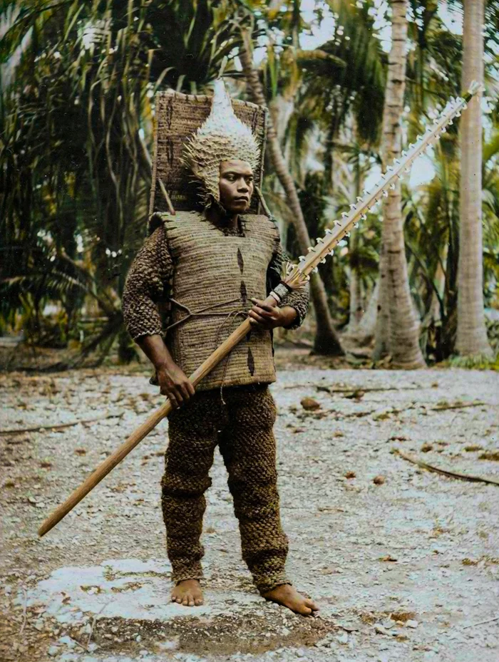 Защитное снаряжение состоит из того, что можно выловить в океане или найти на острове: шлем из рыбы-ежа, меч из акульих зубов, кокосовые волокна и рыбная чешуя.