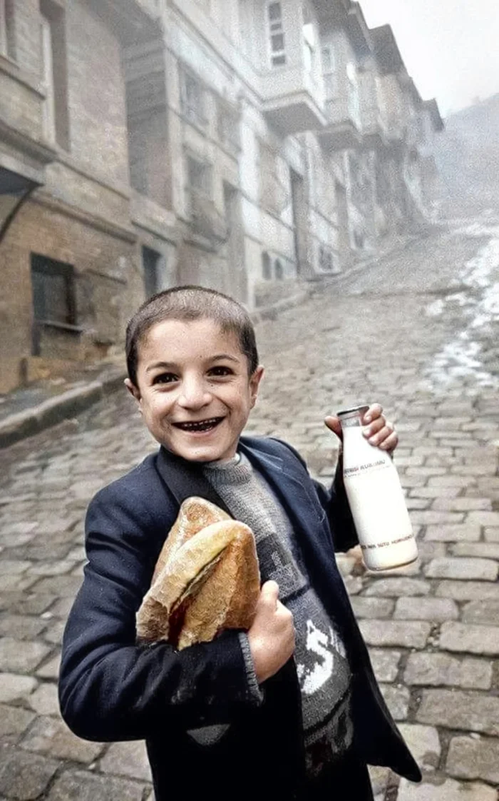 Ребенок с хлебом и молоком. Турция, Стамбул, 1989 год.
