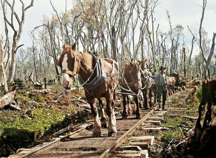 Гужевая железнодорожная повозка с древесиной, перевозящая древесину на лесопилку в Горопито. Новая Зеландия, февраль 1921 год.