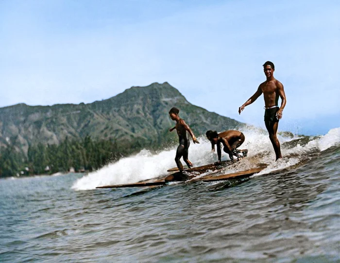 Четыре гавайца занимаются серфингом, пляж Вайкики, 1926 год.