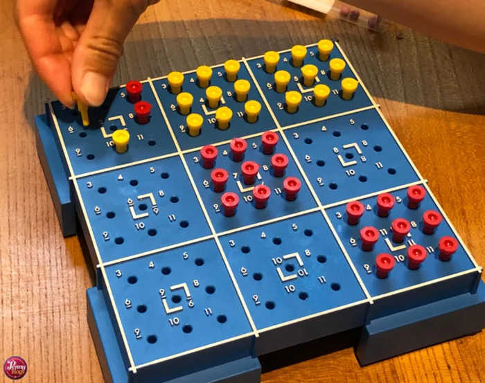 Это игра Super 3. Логика - кидаете 2 кубика. Считаете, сколько выпало. Выпало 2 - вынимаете колышек соперника. Выпало 3-6, 8-11 - ставите колышек в лунку с этой же цифрой. 7- в любую центральную дырку. 12 - ставите куда хотите. Цель игры - заполнить 5 квадратов. Квадрат заполнен, если вы поставили 3 колышка в ряд или 5 колышков не в ряд.