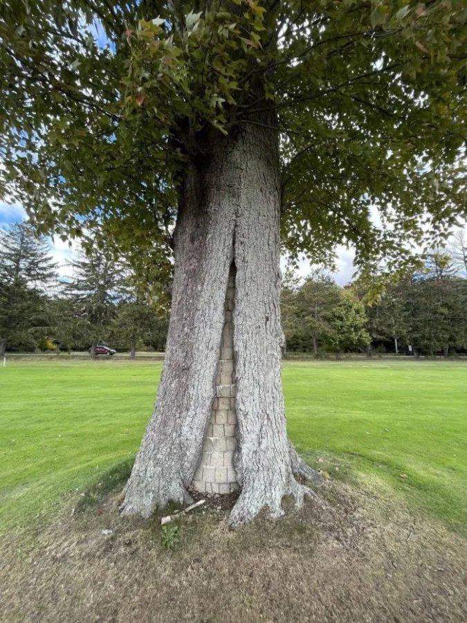 Внутри дерева нашлись сложенные друг на друга кирпичи.