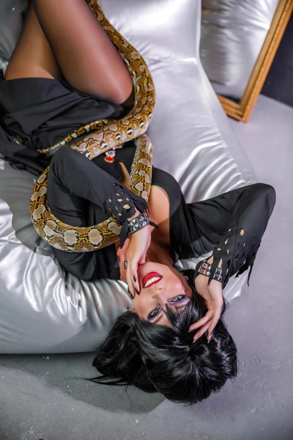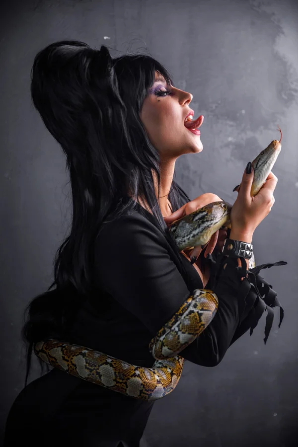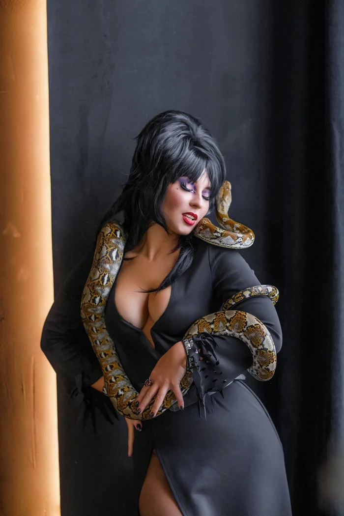 Эффектный косплей Эльвиры, Повелительницы тьмы, дополненный живой змейкой. Грациозность, мрачная эстетика и культовый образ воплощены в этом необычном и впечатляющем костюме.