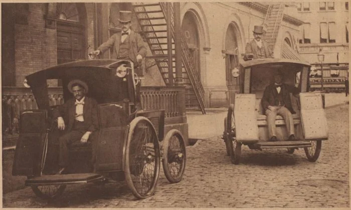 Электробаты, использовавшиеся как первые такси, работали на аккумуляторах, а водители находились за пассажирами.