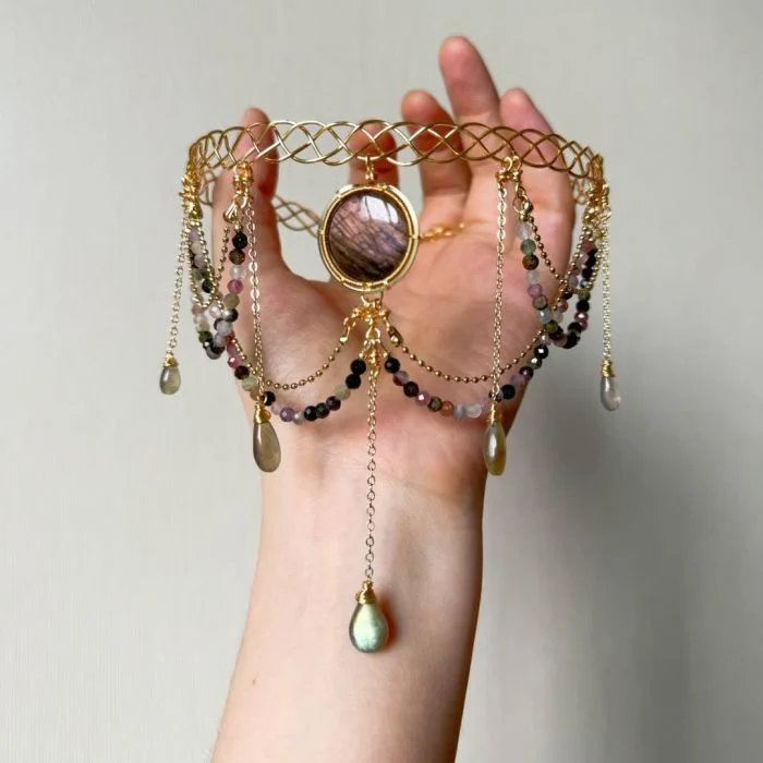 27. Чокер с лабрадоритом и бусинами из лунного камня и турмалина.