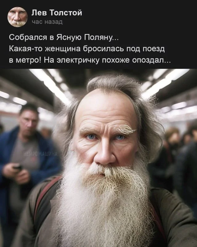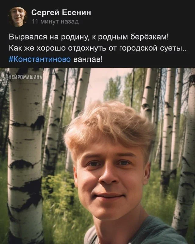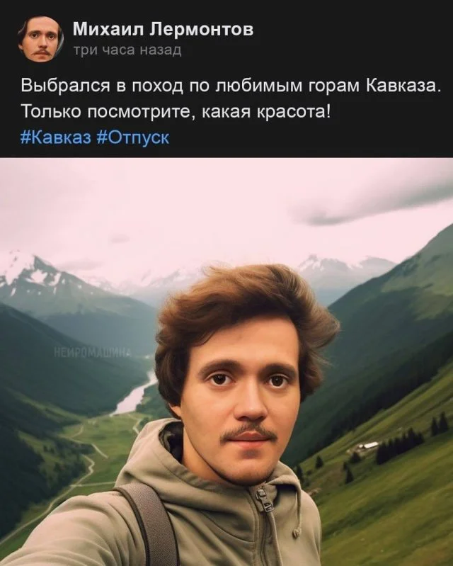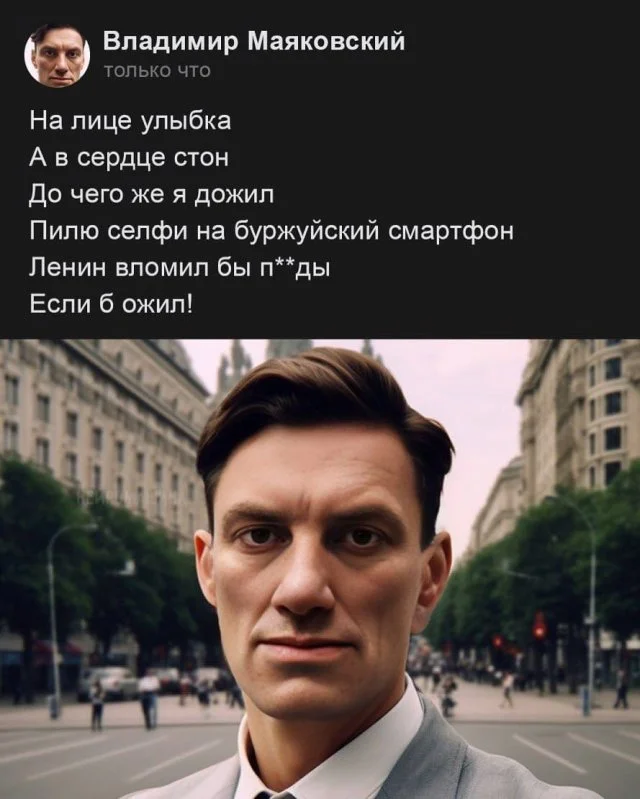 Да, благодаря ИИ мы можем увидеть, что бы постили великие. Например, Гоголь делится фото с хутора любимой бабушки, Есенин, естественно, в окружении березок, Маяковский филигранно использует мат, а Достоевский делает селфи с полицейским, который идет с вызова.