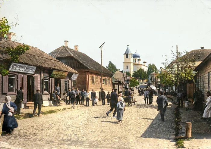 Фотография передаёт атмосферу того времени: дети, интеллигенция, простой народ. Сохранились лишь некоторые дома, а собор был разрушен в 1932 году, осталась только колокольня.