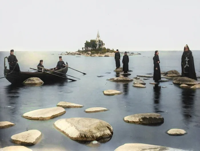 Монахи на озере. Коневский монастырь, 1895–1905 год.