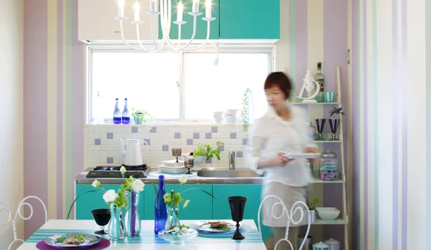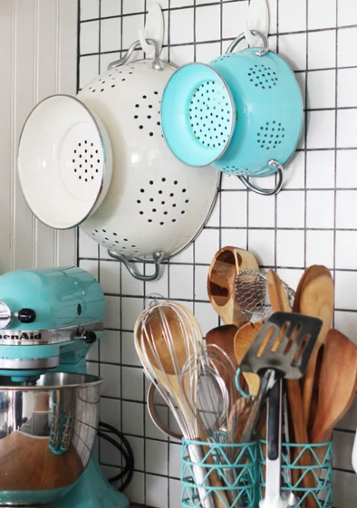 3. Если закрепить даже самые дешевые крючки на обоях с узором и повесить на них яркие кухонные принадлежности, они станут изящными и менее заметными.