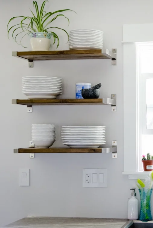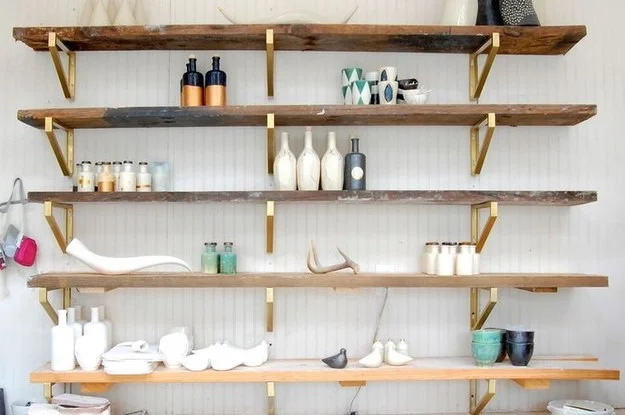 9. Самодельные открытые полки не только помогут сэкономить место, но и украсят голую стену.