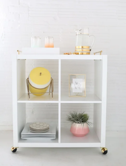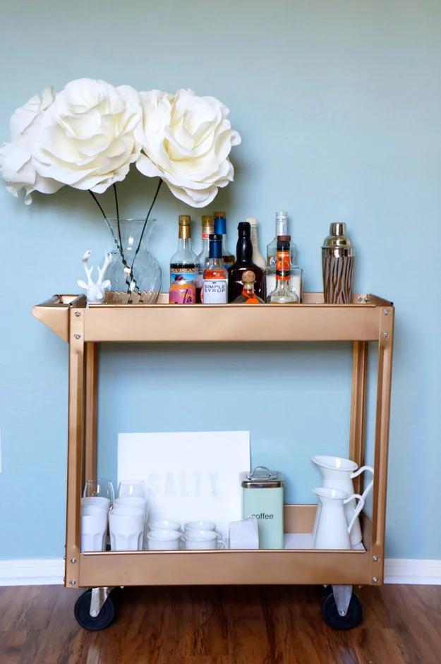 15. Барную тележку необязательно покупать – ее можно сделать из старой книжной полки, прикрепив к ней колесики и ручки.
