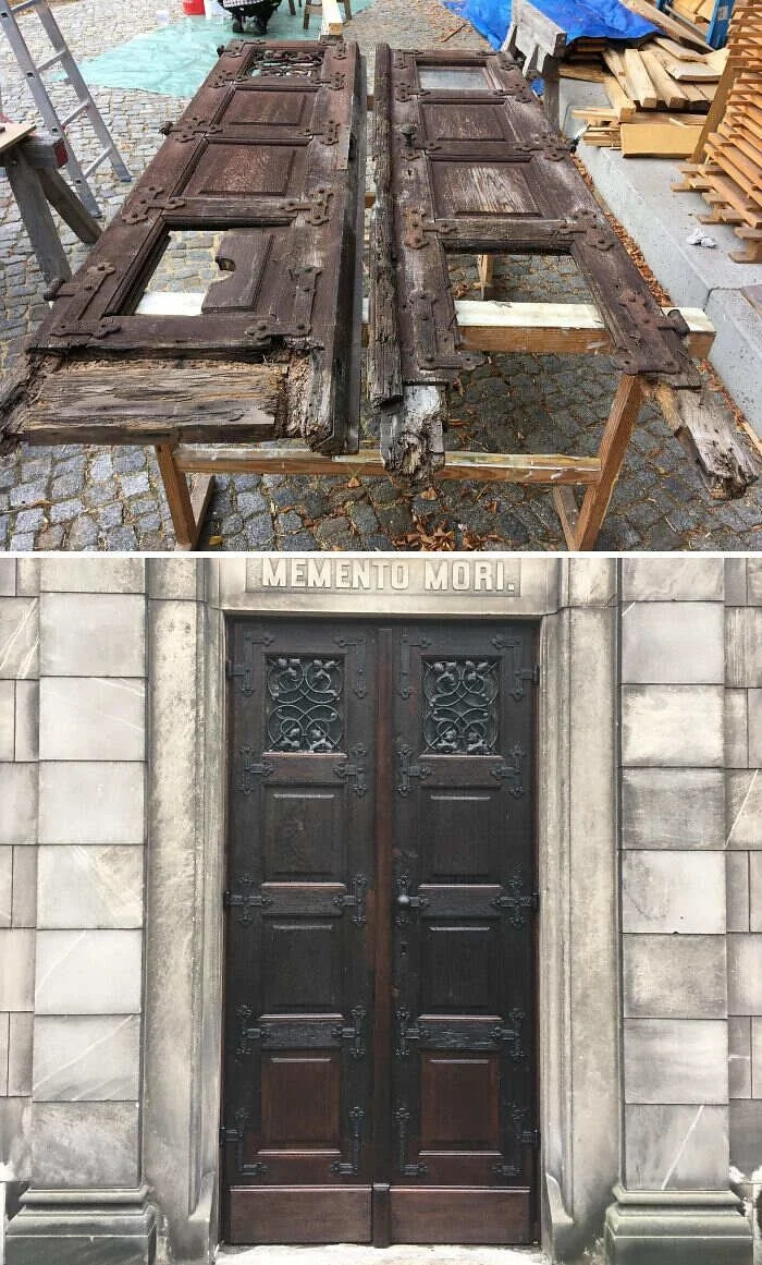 Дверям около 130 лет, они сделаны из дуба и охраняются как культурное наследие. Плотник восстановил недостающие части и обработал поверхность.