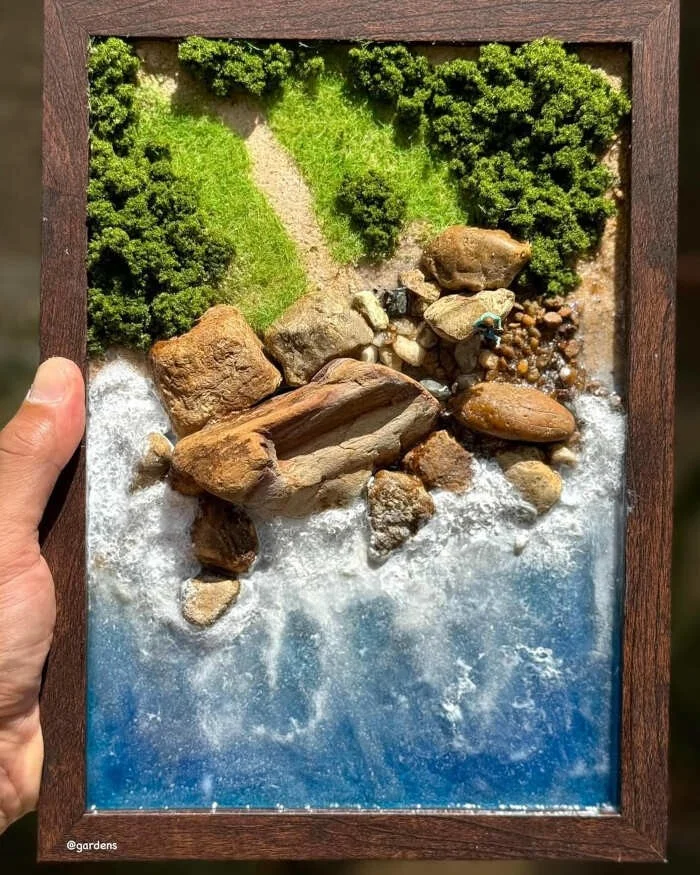 Все детали, от ворот до черепицы, от деревьев до цветов, всё тщательно продумано, и только благодаря сравнению с руками художника, можно сделать вывод о реальном размере этих маленьких шедевров.