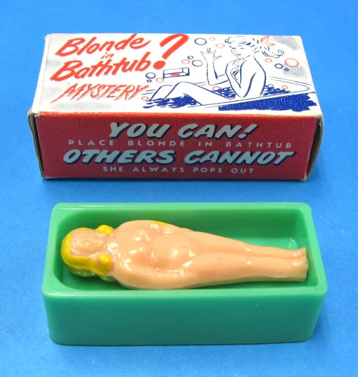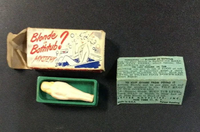 Это старая игрушка-шутка, основанная на магнитах. В руке у знающего девушка спокойно сидит в ванне, при этом в руке у друга она немедленно убегает из нее.